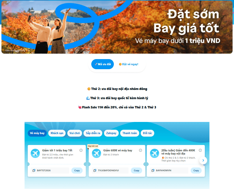 Không chỉ giúp đặt vé nhanh chóng và tiện lợi, Traveloka còn mang đến hàng loạt mã giảm giá, ưu đãi hấp dẫn cho người dùng. Nếu biết cách “săn” đúng thời điểm, bạn hoàn toàn có thể bay cùng Vietnam Airlines với mức giá tốt bất ngờ – thậm chí rẻ hơn nhiều so với tưởng tượng.