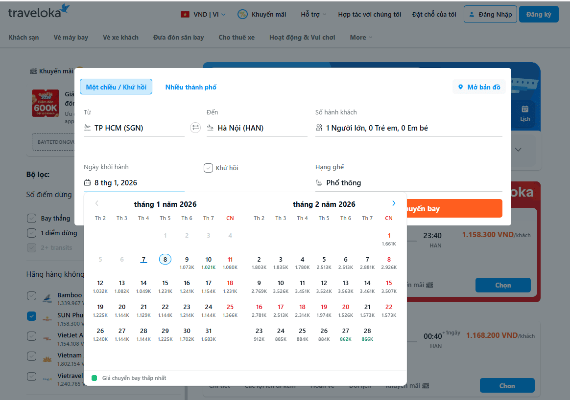 Một lợi thế lớn khác của Traveloka là hệ thống bộ lọc thông minh, hỗ trợ lọc chuyến bay theo giờ khởi hành, thời gian bay, mức giá và hãng hàng không. Traveloka cũng thường xuyên cập nhật ưu đãi và chương trình khuyến mãi, góp phần tăng cơ hội tiếp cận các chuyến bay giá tốt trong giai đoạn cao điểm.